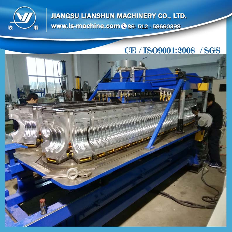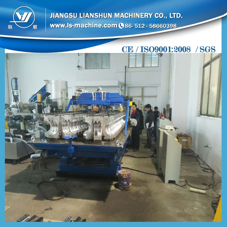 該生產(chǎn)線是以HDPE/PP為原料,所生產(chǎn)的雙壁波紋管內(nèi)壁光滑平整,外壁呈梯形波紋狀,除了具有普通塑料管所具有的耐腐蝕性好、絕緣性高、流動阻力小等特點以外,還因特殊的內(nèi)外壁中空環(huán)形結(jié)構(gòu),使其具有環(huán)剛度大、質(zhì)量輕、耐高壓、韌性好、耐磨、耐沖擊性強、不易破損、施工方便、安裝成本低、使用壽命長等特點。該雙壁波紋管一般采用擴口承插和密封圈連接,可以防止熱脹冷縮的影響,被廣泛應(yīng)用于公路、鐵路路基、地鐵工程、廢棄物填埋場、隧道、綠化帶、運動場及含水量偏高引起的邊坡防護等排水領(lǐng)域。